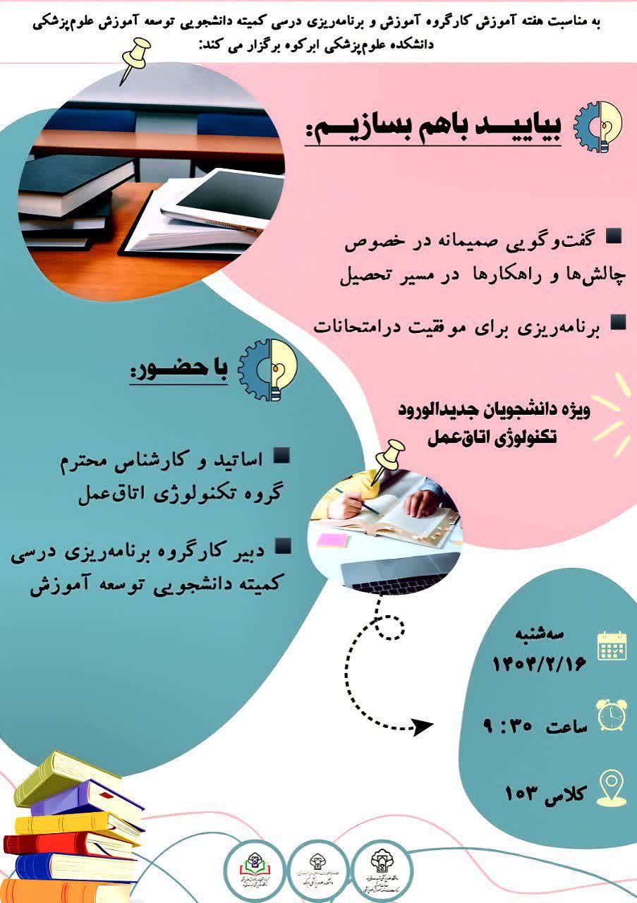 به مناسبت هفته آموزش کارگروه آموزش و برنامه‌ریزی درسی کمیته دانشجویی توسعه آموزش علوم‌پزشکی دانشکده علوم‌پزشکی ابرکوه جلسه دورهمی گروه تکنولوژی اتاق عمل با عنوان “بیاییــد باهم بسازیــم“، با حضــور اساتید و کارشناس محترم گروه تکنولوژی اتاق‌عمل و دبیرکارگروه برنامه‌ریزی درسی کمیته دانشجویی توسعه آموزش علوم‌ پزشکی در روز سه‌شنبه مورخ ۱۴۰۴/۲/۱۶ در کلاس ۱۰۳ برگزار کردند. در این جلسه که برای دانشجویان جدیدالورود گروه تکنولوژی اتاق عمل برگزار گردید، اساتید گروه و سرکار خانم وحدانی، دبیرکارگروه برنامه‌ریزی درسی کمیته دانشجویی توسعه آموزش علوم‌پزشکی به تکنیک‌های مطالعه و اهمیت آن و برخی دیگر از مسائل گروه پرداختند و نظرات و پیشنهادات دانشجویان را در خصوص مسائل آموزشی دریافت نمودند.